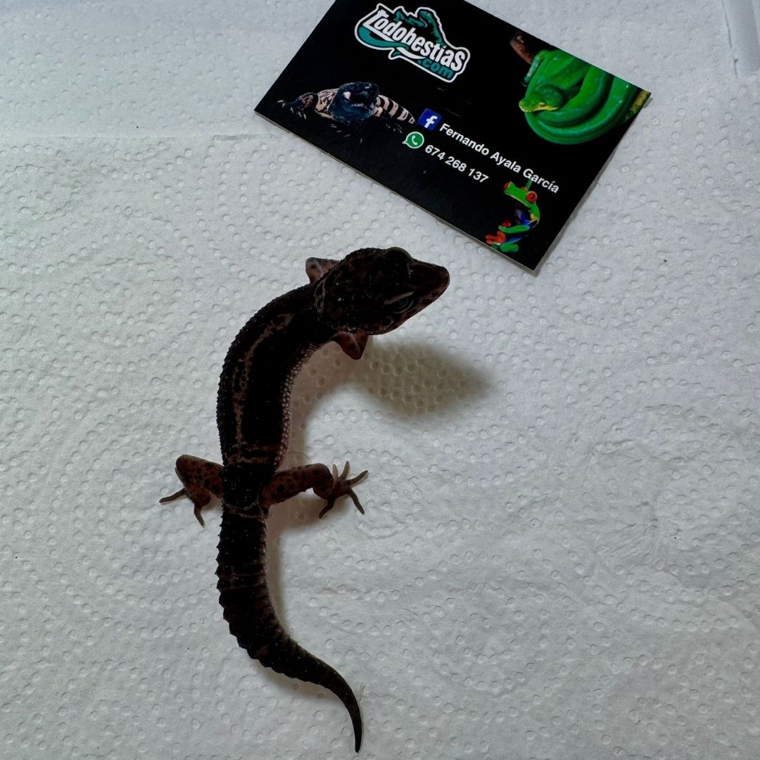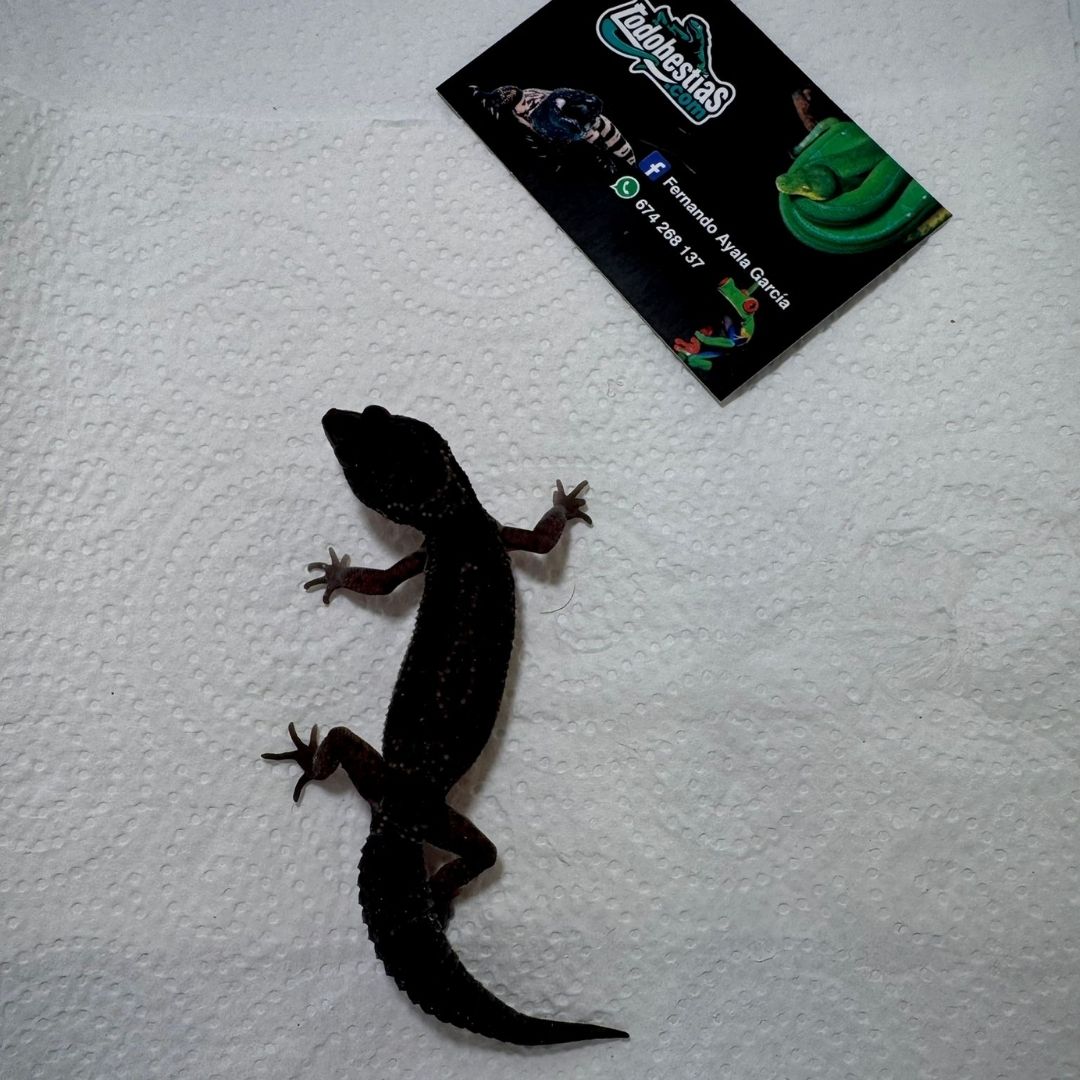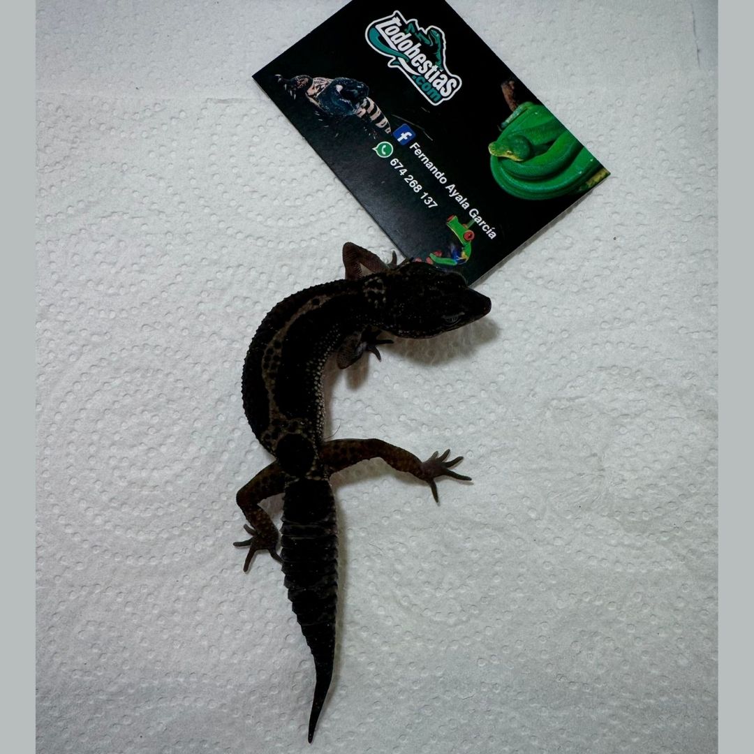En todobestias.com ponemos a tu alcance ejemplares exclusivos de Eublepharis macularis Black Night, una de las fases más impresionantes y codiciadas del gecko leopardo. Su coloración negra profunda y su temperamento tranquilo lo convierten en una auténtica joya para los amantes de los reptiles.